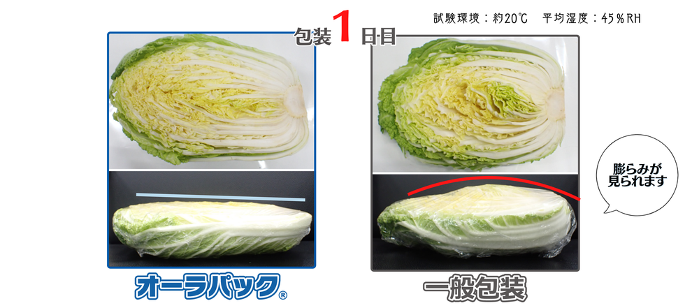オーラパックラップはカット白菜の断面のふくらみを抑制します。