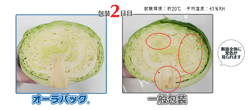 オーラパックラップはカットキャベツの断面の変色を抑制します。