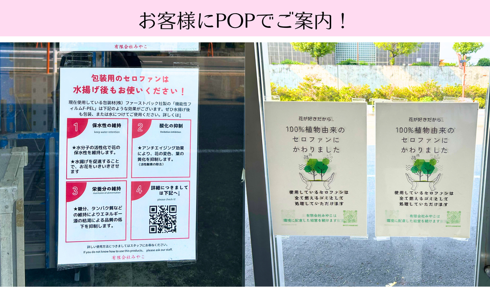 POPなどで環境配慮の取り組みを伝えることで、商品への付加価値としても活用しています。花問屋としては出荷までの期間が短く、鮮度保持効果が売上に直結するわけではありませんが、資材としての価値や会社としての強みを示す手段として非常に有効です。今後も環境に配慮しつつ、花の鮮度保持を支える資材として活用していきたいと考えています。