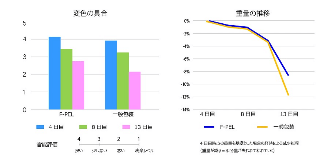 カーネーションをオーラパックと一般包装のそれぞれで包み、温度10℃に管理された環境で3日間保管。その後に温度20℃環境下で3日間保管後に包装を外し、切り戻しを行ってからさらに10日間同じ環境に保管した上で、それぞれの鮮度劣化状況を比較しました。
