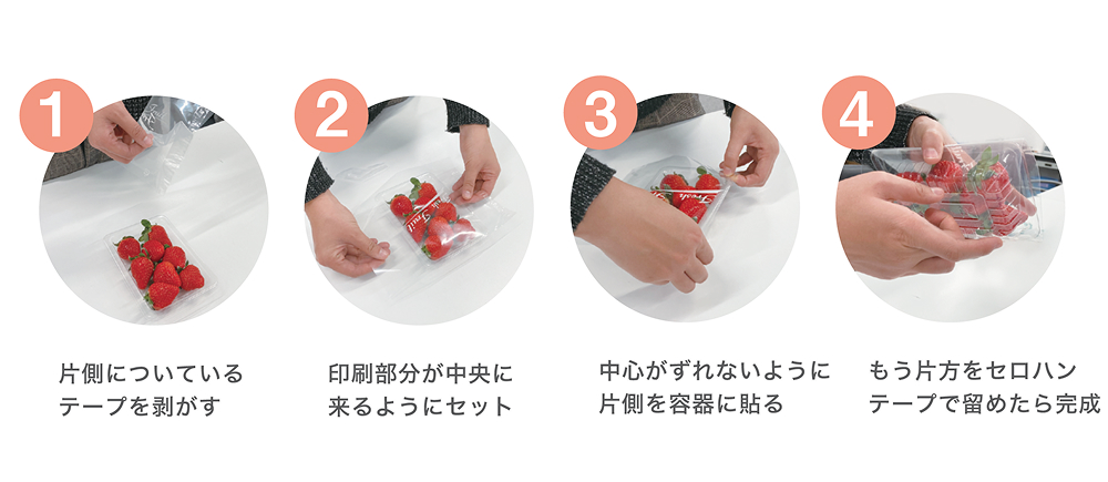 いちごのトレー包装に最適なテープ付きのフルーツパックシートです。