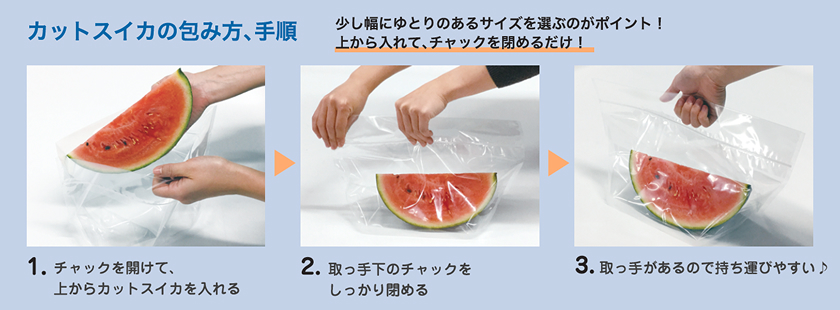 カットスイカ専用の野菜袋にハンドパック形状のチャックつきタイプが登場。