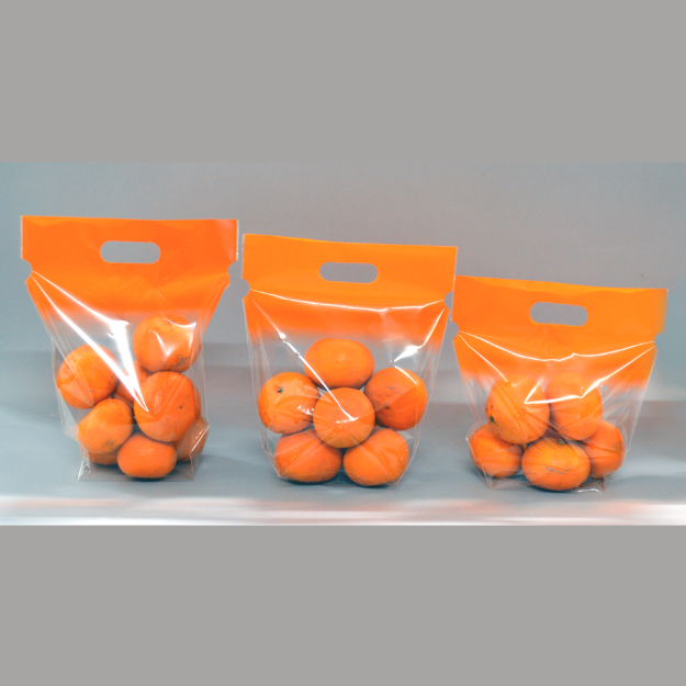 袋上部をピタッと閉じられる、テープ一体型の取っ手付スタンドパック。オレンジ色のグラデーションで、ボリューム感のあるパッと明るい売場に。 幅広のテープでしっかりと閉じられるので、横にしても中身がこぼれず、異物混入を防ぎます。テープ止めに比べ、包装作業を省力化。シーズンによって大きさや内容量が異なるみかんや柑橘類の包装に対応できるよう、細かなサイズラインナップを揃えました!