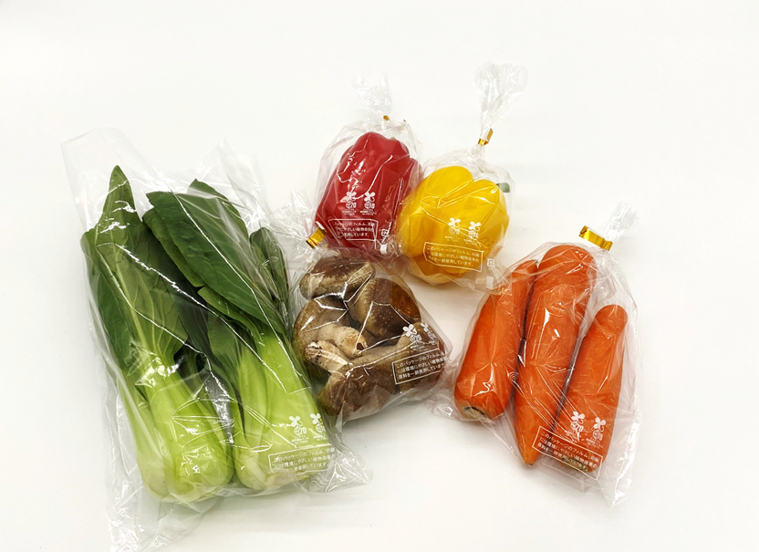 青果物を長持ちさせる袋でフードロス削減、バイオマスプラスチックを配合(10%)しており、バイオマスプラスチックによるCO2削減への寄与が期待できます。