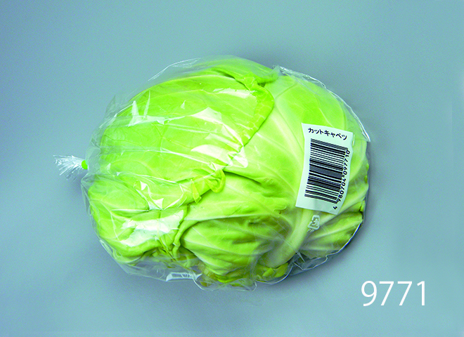 カットキャベツの形に沿うように袋底部がR状になっており見た目もきれい。従来の塩ビラップ包装から袋にすることで、より衛生的に陳列できます。
