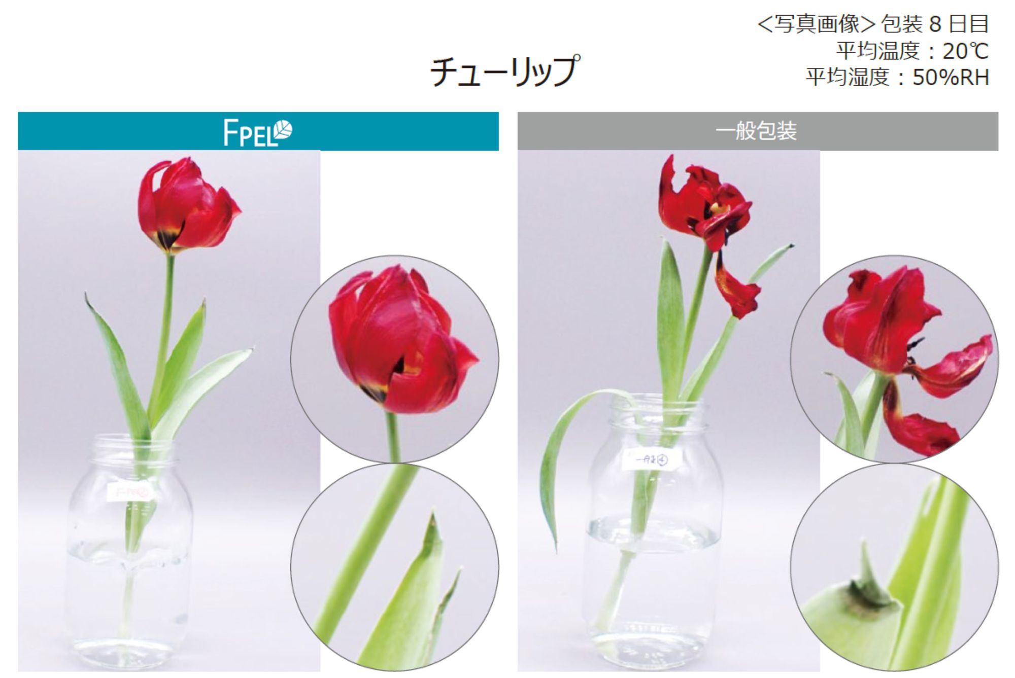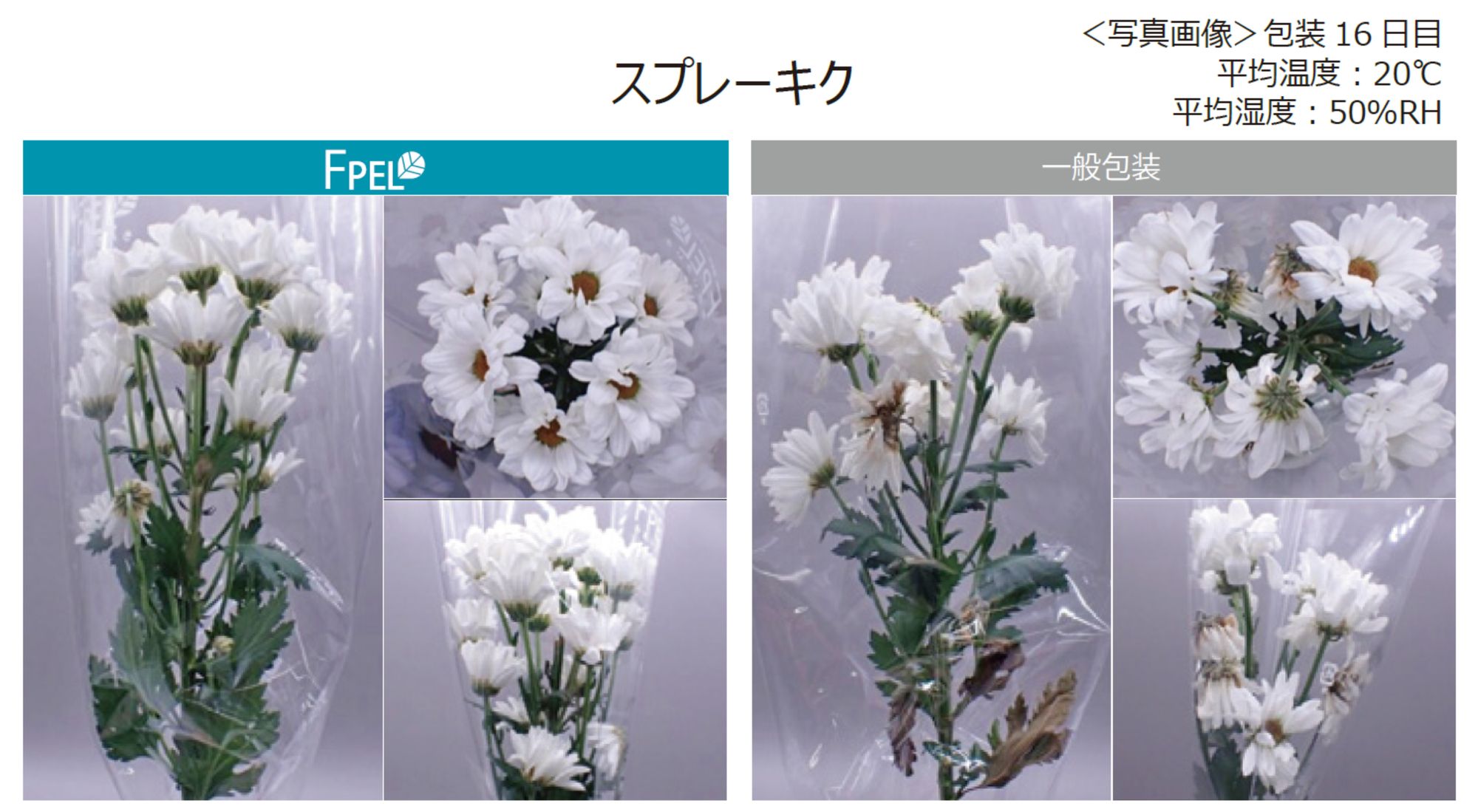 一般包装より、重量の減少が少なく、花のしおれが抑えらています。