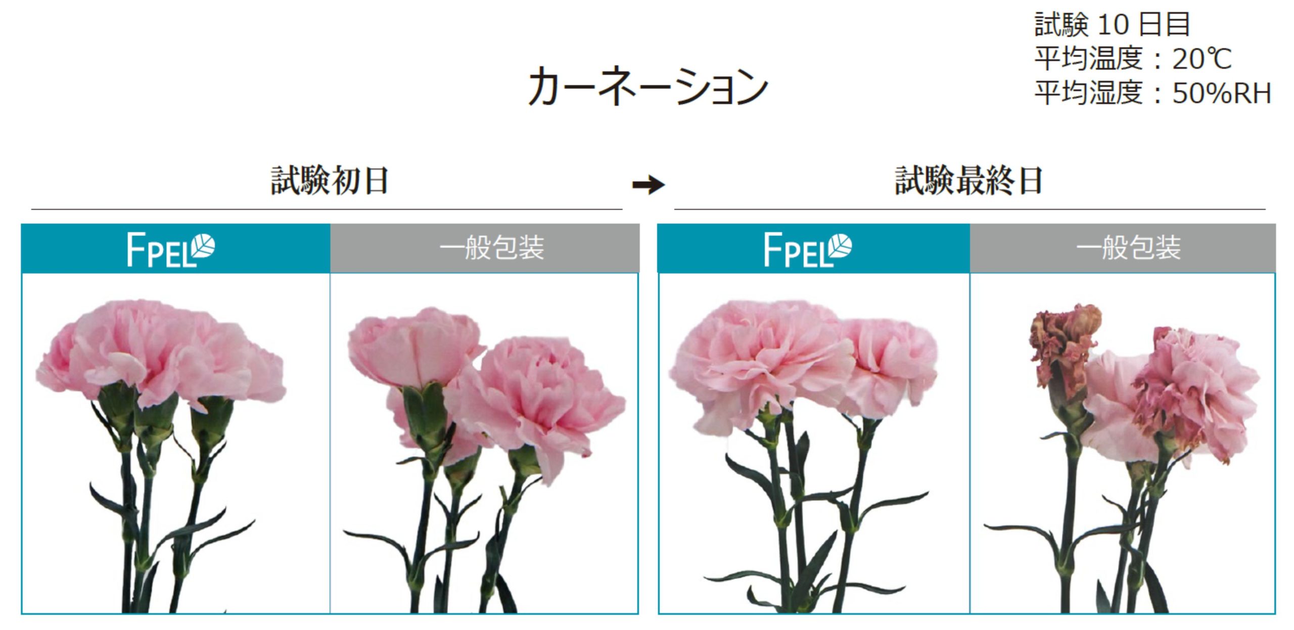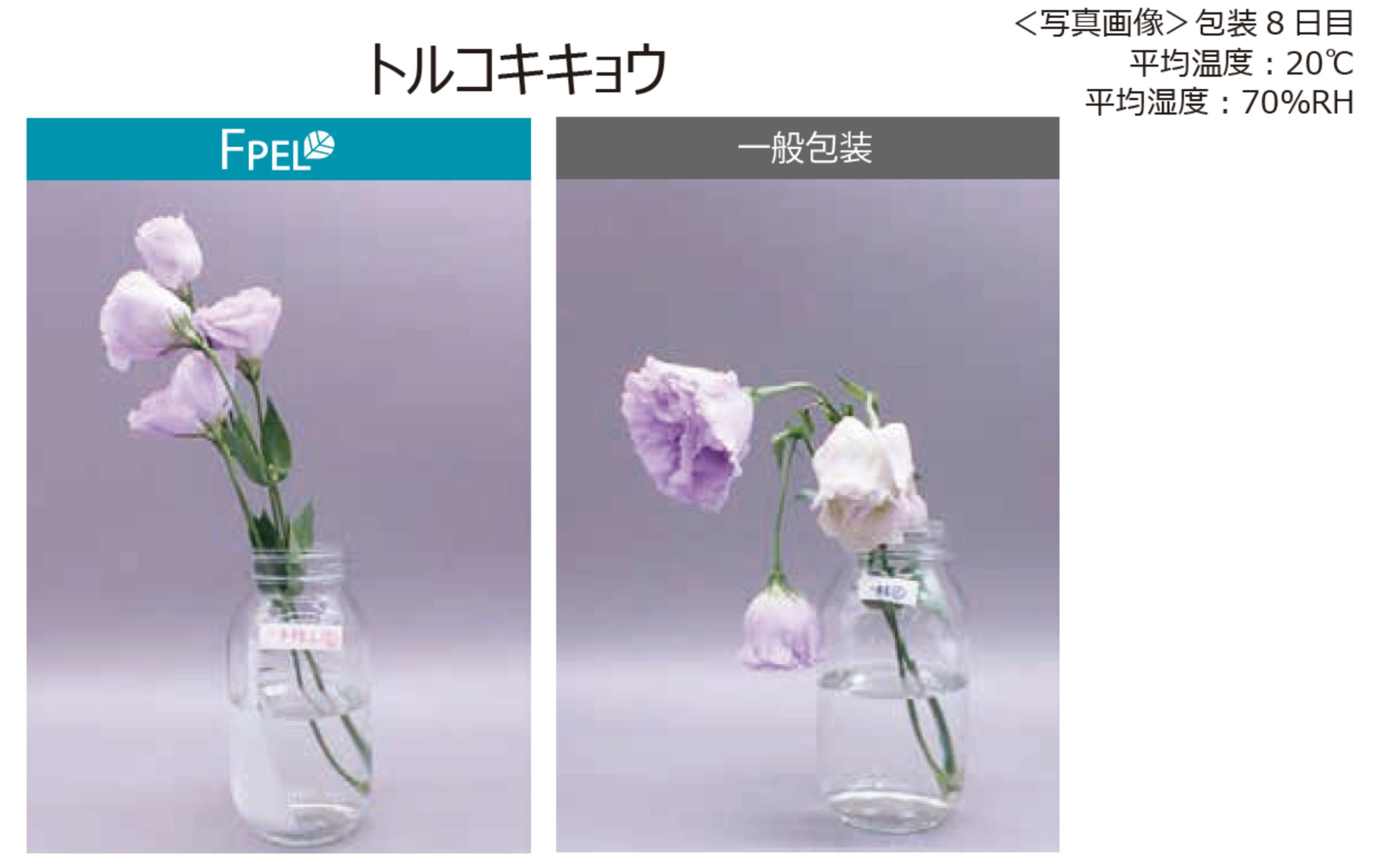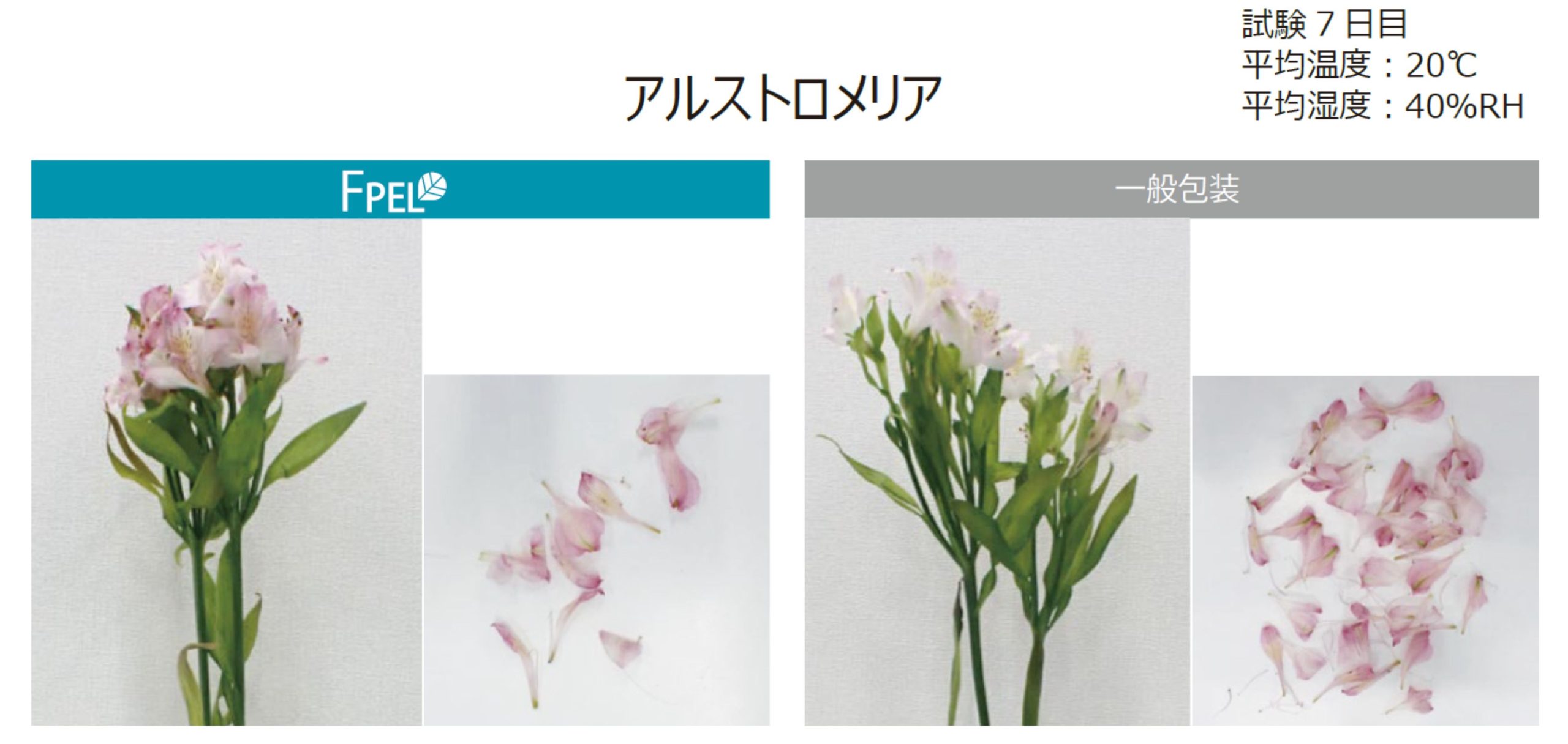一般包装より、重量の減少が少なく、花の開き・変色・しおれが抑えらています。