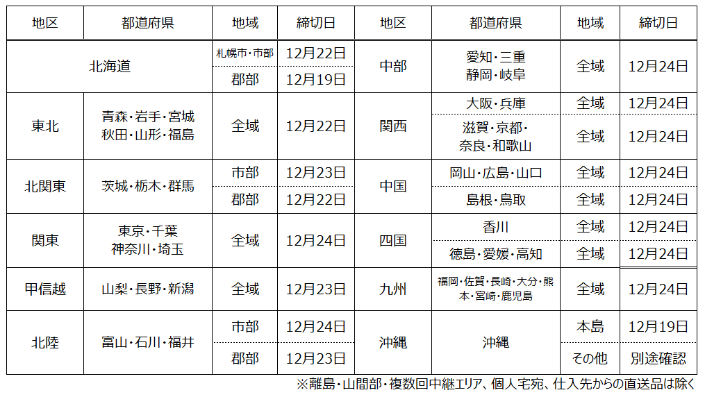 2.地区ごとの年内配達の締切日(運送会社の発表に準じた目安であり、確約ではございません)