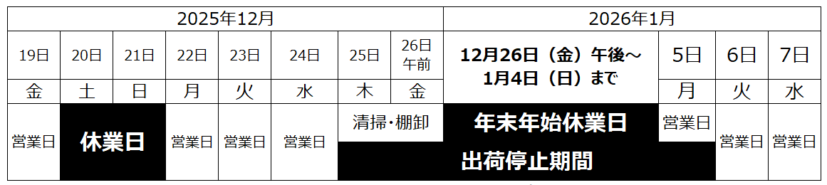 ※12月25日~26日は社内掃除・棚卸等のため、出荷業務は行いません